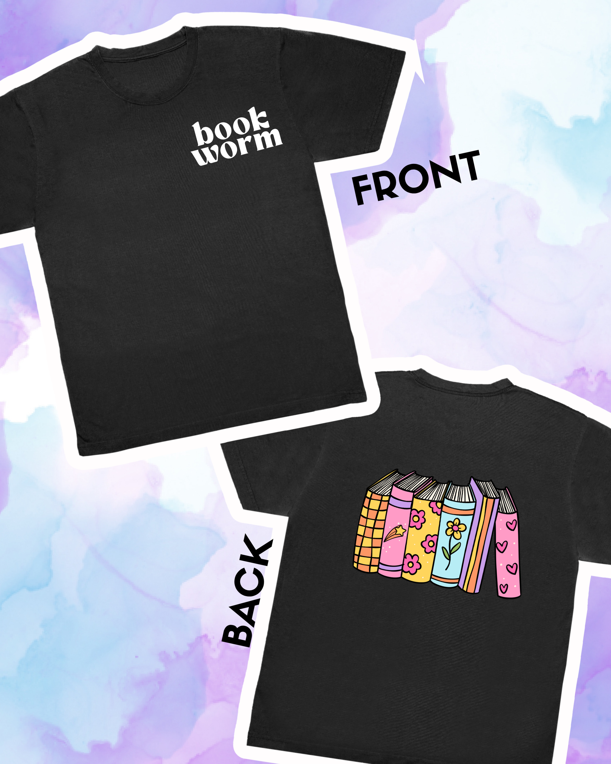 "BOOKWORM" on left upper chest available in white or black color, depending on shirt color.